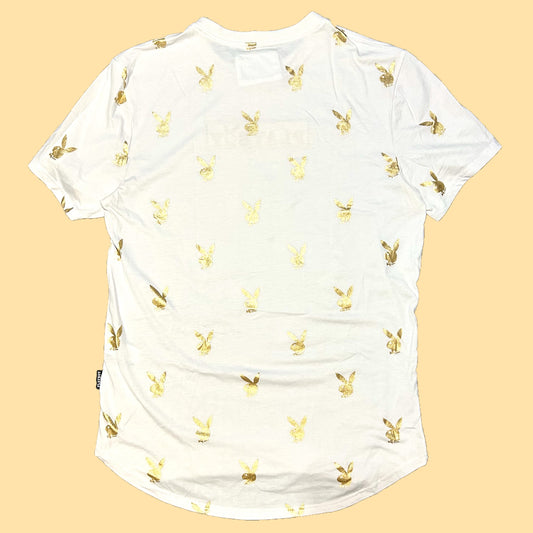 Playboy Gold Bunny Repeat Print T-Shirt w/ Embroidered Logo - Large - White