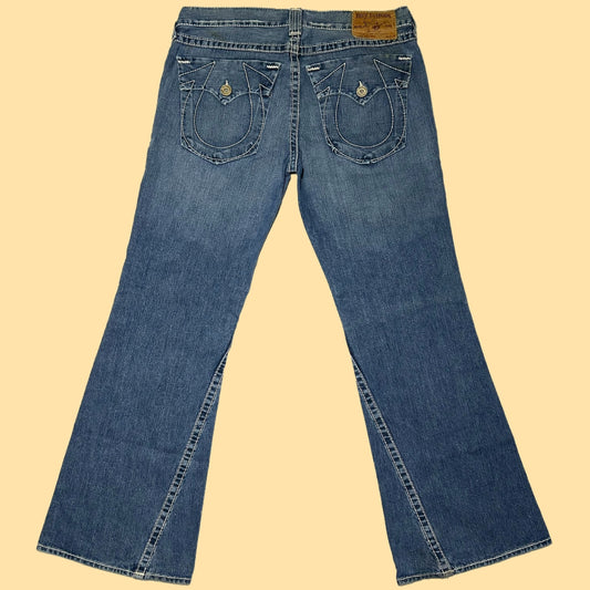 True Religion Joey Big T Flare Jeans Made in USA - 38 x 34 - Light Indigo/White Stitching